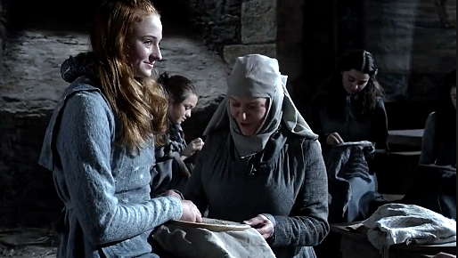 This meaning for Sansa’s textile work is made clear from the beginning of the HBO series, as is shown in the image above from Season 1. Here Sansa shows her embroidery work to the septa who serves as a governess for her and her sister Arya, the septa praises Sansa’s work, and she beams in response. In the background, Arya and other girls work on their embroidery; Arya we later learn, doing so with much less success than her sister. This difference around textile work comes to distinguish between the two sisters in their relationships to norms for femininity in their world. Sansa will strive to fulfill those norms as she strives for excellence in her textile work and for approval from female authority figures. Arya will reject feminine norms and appropriate instead forms gendered as masculine. One of the most obvious of these is her interest in sword fighting: to heighten the contrast between her and her sister, she will name her sword Needle.